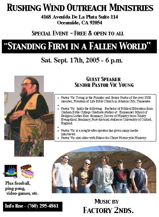 "Standing Firm In A Fallen World" Location: Bikers for Christ Motorcycle Ministry Intl HQ. Rushing Wind Outreach Ministries 4168 Avenida De La Plata, suite 114 Oceanside, Ca. Click on Map or Check Flyer Start time 6:00pm (Possible second show at 9:00pm) Guest Speaker: Senior Pastor Vic Young |